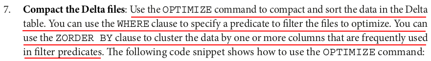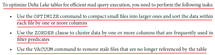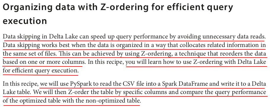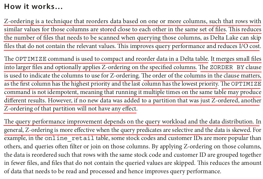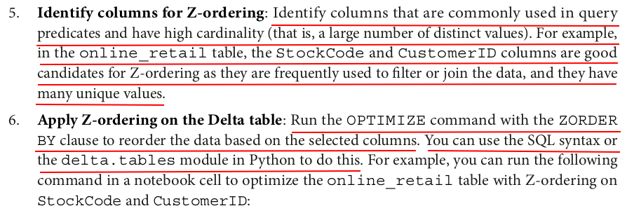 # Get the DeltaTable object for the online_retail table deltaTable = DeltaTable.forPath(spark, "/zdata/Github/Data-Engineering-with-Databricks-Cookbook-main/data/delta_lake/online_retail") # Optimize the table with Z-Ordering on StockCode and CustomerID deltaTable.optimize().executeZOrderBy("StockCode", "CustomerID")