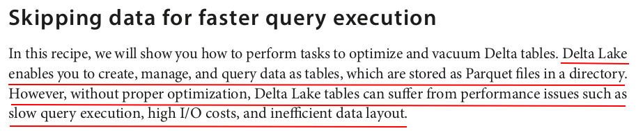# Query the original table query = "spark.sql(\"SELECT StockCode, CustomerID, SUM(Quantity) AS TotalQuantity FROM delta.`/zdata/Github/Data-Engineering-with-Databricks-Cookbook-main/data/delta_lake/online_retail` GROUP BY StockCode, CustomerID\").show()" query_time = timeit.timeit(query, number=1, globals=globals()) print(f"Time taken for original table: {query_time} seconds")