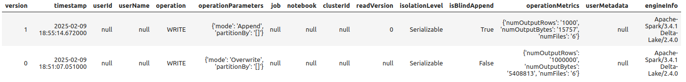 %%sparksql DESCRIBE HISTORY delta.`/zdata/Github/Data-Engineering-with-Databricks-Cookbook-main/data/tmp/employee_salary`