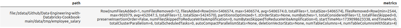 %%sparksql OPTIMIZE delta.`/zdata/Github/Data-Engineering-with-Databricks-Cookbook-main/data/tmp/employee_salary`