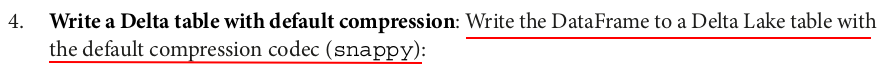 # Write the DataFrame to a Delta Lake table with the default compression codec (snappy) (df.write.format("delta") .mode("overwrite") .save("../data/tmp/employee_salary_snappy"))