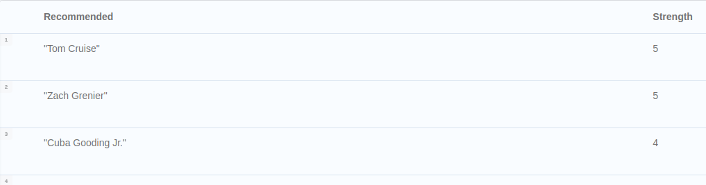 RETURN cocoActors.name AS Recommended, count(*) AS Strength