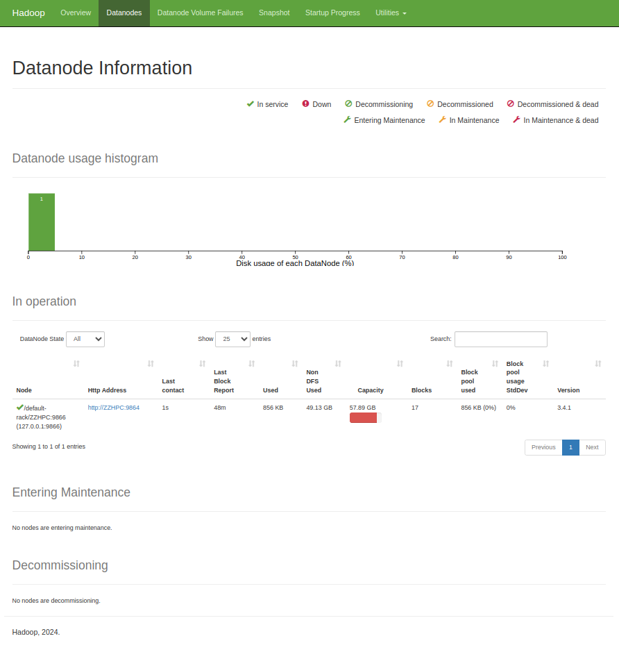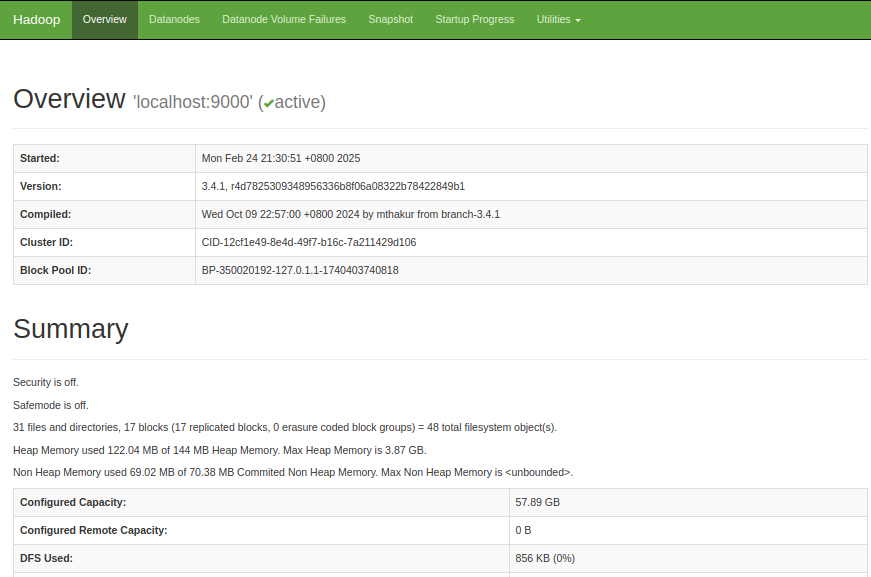 zzh@ZZHPC:~/Downloads/sfw/hadoop-3.4.1$ hdfs dfs -mkdir -p /user/zzh zzh@ZZHPC:~/Downloads/sfw/hadoop-3.4.1$ hdfs dfs -mkdir input zzh@ZZHPC:~/Downloads/sfw/hadoop-3.4.1$ hdfs dfs -put etc/hadoop/*.xml input zzh@ZZHPC:~/Downloads/sfw/hadoop-3.4.1$ hadoop jar share/hadoop/mapreduce/hadoop-mapreduce-examples-3.4.1.jar grep input output 'dfs[a-z.]+' 2025-02-24 22:07:39,205 INFO client.DefaultNoHARMFailoverProxyProvider: Connecting to ResourceManager at /0.0.0.0:8032 2025-02-24 22:07:39,489 INFO mapreduce.JobResourceUploader: Disabling Erasure Coding for path: /tmp/hadoop-yarn/staging/zzh/.staging/job_1740405589608_0001 2025-02-24 22:07:39,675 INFO input.FileInputFormat: Total input files to process : 10 2025-02-24 22:07:39,710 INFO mapreduce.JobSubmitter: number of splits:10 2025-02-24 22:07:39,824 INFO mapreduce.JobSubmitter: Submitting tokens for job: job_1740405589608_0001 2025-02-24 22:07:39,824 INFO mapreduce.JobSubmitter: Executing with tokens: [] 2025-02-24 22:07:39,932 INFO conf.Configuration: resource-types.xml not found 2025-02-24 22:07:39,932 INFO resource.ResourceUtils: Unable to find 'resource-types.xml'. 2025-02-24 22:07:40,331 INFO impl.YarnClientImpl: Submitted application application_1740405589608_0001 2025-02-24 22:07:40,350 INFO mapreduce.Job: The url to track the job: http://ZZHPC:8088/proxy/application_1740405589608_0001/ 2025-02-24 22:07:40,350 INFO mapreduce.Job: Running job: job_1740405589608_0001 2025-02-24 22:07:45,415 INFO mapreduce.Job: Job job_1740405589608_0001 running in uber mode : false 2025-02-24 22:07:45,415 INFO mapreduce.Job: map 0% reduce 0% 2025-02-24 22:07:52,533 INFO mapreduce.Job: map 60% reduce 0% 2025-02-24 22:10:04,187 INFO mapreduce.Job: map 100% reduce 0% 2025-02-24 22:10:05,191 INFO mapreduce.Job: map 100% reduce 100% 2025-02-24 22:10:06,204 INFO mapreduce.Job: Job job_1740405589608_0001 completed successfully 2025-02-24 22:10:06,262 INFO mapreduce.Job: Counters: 55 File System Counters FILE: Number of bytes read=115 FILE: Number of bytes written=3402632 FILE: Number of read operations=0 FILE: Number of large read operations=0 FILE: Number of write operations=0 HDFS: Number of bytes read=34084 HDFS: Number of bytes written=219 HDFS: Number of read operations=35 HDFS: Number of large read operations=0 HDFS: Number of write operations=2 HDFS: Number of bytes read erasure-coded=0 Job Counters Killed map tasks=1 Launched map tasks=10 Launched reduce tasks=1 Data-local map tasks=4 Total time spent by all maps in occupied slots (ms)=21521 Total time spent by all reduces in occupied slots (ms)=5166 Total time spent by all map tasks (ms)=21521 Total time spent by all reduce tasks (ms)=5166 Total vcore-milliseconds taken by all map tasks=21521 Total vcore-milliseconds taken by all reduce tasks=5166 Total megabyte-milliseconds taken by all map tasks=22037504 Total megabyte-milliseconds taken by all reduce tasks=5289984 Map-Reduce Framework Map input records=876 Map output records=4 Map output bytes=101 Map output materialized bytes=169 Input split bytes=1169 Combine input records=4 Combine output records=4 Reduce input groups=4 Reduce shuffle bytes=169 Reduce input records=4 Reduce output records=4 Spilled Records=8 Shuffled Maps =10 Failed Shuffles=0 Merged Map outputs=10 GC time elapsed (ms)=457 CPU time spent (ms)=5900 Physical memory (bytes) snapshot=3124326400 Virtual memory (bytes) snapshot=30447472640 Total committed heap usage (bytes)=1874853888 Peak Map Physical memory (bytes)=298938368 Peak Map Virtual memory (bytes)=2768130048 Peak Reduce Physical memory (bytes)=179384320 Peak Reduce Virtual memory (bytes)=2773512192 Shuffle Errors BAD_ID=0 CONNECTION=0 IO_ERROR=0 WRONG_LENGTH=0 WRONG_MAP=0 WRONG_REDUCE=0 File Input Format Counters Bytes Read=32915 File Output Format Counters Bytes Written=219 2025-02-24 22:10:06,289 INFO client.DefaultNoHARMFailoverProxyProvider: Connecting to ResourceManager at /0.0.0.0:8032 2025-02-24 22:10:06,313 INFO mapreduce.JobResourceUploader: Disabling Erasure Coding for path: /tmp/hadoop-yarn/staging/zzh/.staging/job_1740405589608_0002 2025-02-24 22:10:06,746 INFO input.FileInputFormat: Total input files to process : 1 2025-02-24 22:10:06,767 INFO mapreduce.JobSubmitter: number of splits:1 2025-02-24 22:10:07,193 INFO mapreduce.JobSubmitter: Submitting tokens for job: job_1740405589608_0002 2025-02-24 22:10:07,193 INFO mapreduce.JobSubmitter: Executing with tokens: [] 2025-02-24 22:10:07,209 INFO impl.YarnClientImpl: Submitted application application_1740405589608_0002 2025-02-24 22:10:07,212 INFO mapreduce.Job: The url to track the job: http://ZZHPC:8088/proxy/application_1740405589608_0002/ 2025-02-24 22:10:07,212 INFO mapreduce.Job: Running job: job_1740405589608_0002 2025-02-24 22:10:16,276 INFO mapreduce.Job: Job job_1740405589608_0002 running in uber mode : false 2025-02-24 22:10:16,276 INFO mapreduce.Job: map 0% reduce 0% 2025-02-24 22:10:19,291 INFO mapreduce.Job: map 100% reduce 0% 2025-02-24 22:10:23,305 INFO mapreduce.Job: map 100% reduce 100% 2025-02-24 22:10:24,313 INFO mapreduce.Job: Job job_1740405589608_0002 completed successfully 2025-02-24 22:10:24,327 INFO mapreduce.Job: Counters: 54 File System Counters FILE: Number of bytes read=115 FILE: Number of bytes written=617641 FILE: Number of read operations=0 FILE: Number of large read operations=0 FILE: Number of write operations=0 HDFS: Number of bytes read=348 HDFS: Number of bytes written=77 HDFS: Number of read operations=9 HDFS: Number of large read operations=0 HDFS: Number of write operations=2 HDFS: Number of bytes read erasure-coded=0 Job Counters Launched map tasks=1 Launched reduce tasks=1 Data-local map tasks=1 Total time spent by all maps in occupied slots (ms)=1500 Total time spent by all reduces in occupied slots (ms)=1560 Total time spent by all map tasks (ms)=1500 Total time spent by all reduce tasks (ms)=1560 Total vcore-milliseconds taken by all map tasks=1500 Total vcore-milliseconds taken by all reduce tasks=1560 Total megabyte-m