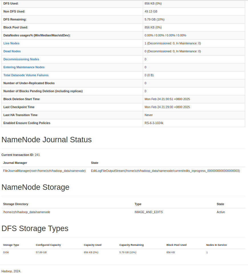 zzh@ZZHPC:~$ hdfs namenode -format 2025-02-24 21:29:00,167 INFO namenode.NameNode: STARTUP_MSG: /************************************************************ STARTUP_MSG: Starting NameNode STARTUP_MSG: host = ZZHPC/127.0.1.1 STARTUP_MSG: args = [-format] STARTUP_MSG: version = 3.4.1 STARTUP_MSG: classpath = /home/zzh/Downloads/sfw/hadoop-3.4.1/etc/hadoop:/home/zzh/Downloads/sfw/hadoop-3.4.1/share/hadoop/common/lib/commons-collections-3.2.2.jar:/home/zzh/Downloads/sfw/hadoop-3.4.1/share/hadoop/common/lib/jetty-servlet-9.4.53.v20231009.jar:/home/zzh/Downloads/sfw/hadoop-3.4.1/share/hadoop/common/lib/netty-codec-mqtt-4.1.100.Final.jar:/home/zzh/Downloads/sfw/hadoop-3.4.1/share/hadoop/common/lib/commons-beanutils-1.9.4.jar:/home/zzh/Downloads/sfw/hadoop-3.4.1/share/hadoop/common/lib/listenablefuture-9999.0-empty-to-avoid-conflict-with-guava.jar:/home/zzh/Downloads/sfw/hadoop-3.4.1/share/hadoop/common/lib/netty-resolver-dns-4.1.100.Final.jar:/home/zzh/Downloads/sfw/hadoop-3.4.1/share/hadoop/common/lib/commons-logging-1.2.jar:/home/zzh/Downloads/sfw/hadoop-3.4.1/share/hadoop/common/lib/netty-codec-memcache-4.1.100.Final.jar:/home/zzh/Downloads/sfw/hadoop-3.4.1/share/hadoop/common/lib/netty-codec-dns-4.1.100.Final.jar:/home/zzh/Downloads/sfw/hadoop-3.4.1/share/hadoop/common/lib/commons-codec-1.15.jar:/home/zzh/Downloads/sfw/hadoop-3.4.1/share/hadoop/common/lib/commons-net-3.9.0.jar:/home/zzh/Downloads/sfw/hadoop-3.4.1/share/hadoop/common/lib/jackson-databind-2.12.7.1.jar:/home/zzh/Downloads/sfw/hadoop-3.4.1/share/hadoop/common/lib/kerb-core-2.0.3.jar:/home/zzh/Downloads/sfw/hadoop-3.4.1/share/hadoop/common/lib/netty-buffer-4.1.100.Final.jar:/home/zzh/Downloads/sfw/hadoop-3.4.1/share/hadoop/common/lib/commons-lang3-3.12.0.jar:/home/zzh/Downloads/sfw/hadoop-3.4.1/share/hadoop/common/lib/metrics-core-3.2.4.jar:/home/zzh/Downloads/sfw/hadoop-3.4.1/share/hadoop/common/lib/netty-codec-redis-4.1.100.Final.jar:/home/zzh/Downloads/sfw/hadoop-3.4.1/share/hadoop/common/lib/slf4j-api-1.7.36.jar:/home/zzh/Downloads/sfw/hadoop-3.4.1/share/hadoop/common/lib/reload4j-1.2.22.jar:/home/zzh/Downloads/sfw/hadoop-3.4.1/share/hadoop/common/lib/jersey-json-1.22.0.jar:/home/zzh/Downloads/sfw/hadoop-3.4.1/share/hadoop/common/lib/curator-client-5.2.0.jar:/home/zzh/Downloads/sfw/hadoop-3.4.1/share/hadoop/common/lib/nimbus-jose-jwt-9.37.2.jar:/home/zzh/Downloads/sfw/hadoop-3.4.1/share/hadoop/common/lib/jcip-annotations-1.0-1.jar:/home/zzh/Downloads/sfw/hadoop-3.4.1/share/hadoop/common/lib/netty-handler-4.1.100.Final.jar:/home/zzh/Downloads/sfw/hadoop-3.4.1/share/hadoop/common/lib/j2objc-annotations-1.1.jar:/home/zzh/Downloads/sfw/hadoop-3.4.1/share/hadoop/common/lib/netty-transport-native-unix-common-4.1.100.Final.jar:/home/zzh/Downloads/sfw/hadoop-3.4.1/share/hadoop/common/lib/netty-common-4.1.100.Final.jar:/home/zzh/Downloads/sfw/hadoop-3.4.1/share/hadoop/common/lib/re2j-1.1.jar:/home/zzh/Downloads/sfw/hadoop-3.4.1/share/hadoop/common/lib/jul-to-slf4j-1.7.36.jar:/home/zzh/Downloads/sfw/hadoop-3.4.1/share/hadoop/common/lib/stax2-api-4.2.1.jar:/home/zzh/Downloads/sfw/hadoop-3.4.1/share/hadoop/common/lib/netty-all-4.1.100.Final.jar:/home/zzh/Downloads/sfw/hadoop-3.4.1/share/hadoop/common/lib/httpclient-4.5.13.jar:/home/zzh/Downloads/sfw/hadoop-3.4.1/share/hadoop/common/lib/jersey-server-1.19.4.jar:/home/zzh/Downloads/sfw/hadoop-3.4.1/share/hadoop/common/lib/netty-transport-native-epoll-4.1.100.Final-linux-aarch_64.jar:/home/zzh/Downloads/sfw/hadoop-3.4.1/share/hadoop/common/lib/netty-resolver-4.1.100.Final.jar:/home/zzh/Downloads/sfw/hadoop-3.4.1/share/hadoop/common/lib/netty-transport-native-kqueue-4.1.100.Final-osx-aarch_64.jar:/home/zzh/Downloads/sfw/hadoop-3.4.1/share/hadoop/common/lib/slf4j-reload4j-1.7.36.jar:/home/zzh/Downloads/sfw/hadoop-3.4.1/share/hadoop/common/lib/jakarta.activation-api-1.2.1.jar:/home/zzh/Downloads/sfw/hadoop-3.4.1/share/hadoop/common/lib/netty-transport-4.1.100.Final.jar:/home/zzh/Downloads/sfw/hadoop-3.4.1/share/hadoop/common/lib/jetty-util-ajax-9.4.53.v20231009.jar:/home/zzh/Downloads/sfw/hadoop-3.4.1/share/hadoop/common/lib/woodstox-core-5.4.0.jar:/home/zzh/Downloads/sfw/hadoop-3.4.1/share/hadoop/common/lib/netty-resolver-dns-native-macos-4.1.100.Final-osx-x86_64.jar:/home/zzh/Downloads/sfw/hadoop-3.4.1/share/hadoop/common/lib/snappy-java-1.1.10.4.jar:/home/zzh/Downloads/sfw/hadoop-3.4.1/share/hadoop/common/lib/animal-sniffer-annotations-1.17.jar:/home/zzh/Downloads/sfw/hadoop-3.4.1/share/hadoop/common/lib/zookeeper-jute-3.8.4.jar:/home/zzh/Downloads/sfw/hadoop-3.4.1/share/hadoop/common/lib/jsr305-3.0.2.jar:/home/zzh/Downloads/sfw/hadoop-3.4.1/share/hadoop/common/lib/failureaccess-1.0.jar:/home/zzh/Downloads/sfw/hadoop-3.4.1/share/hadoop/common/lib/jsr311-api-1.1.1.jar:/home/zzh/Downloads/sfw/hadoop-3.4.1/share/hadoop/common/lib/jetty-util-9.4.53.v20231009.jar:/home/zzh/Downloads/sfw/hadoop-3.4.1/share/hadoop/common/lib/netty-codec-haproxy-4.1.100.Final.jar:/home/zzh/Downloads/sfw/hadoop-3.4.1/share/hadoop/common/lib/netty-transport-classes-kqueue-4.1.100.Final.jar:/home/zzh/Downloads/sfw/hadoop-3.4.1/share/hadoop/common/lib/javax.servlet-api-3.1.0.jar:/home/zzh/Downloads/sfw/hadoop-3.4.1/share/hadoop/common/lib/jetty-xml-9.4.53.v20231009.jar:/home/zzh/Downloads/sfw/hadoop-3.4.1/share/hadoop/common/lib/jetty-webapp-9.4.53.v20231009.jar:/home/zzh/Downloads/sfw/hadoop-3.4.1/share/hadoop/common/lib/commons-text-1.10.0.jar:/home/zzh/Downloads/sfw/hadoop-3.4.1/share/hadoop/common/lib/netty-transport-classes-epoll-4.1.100.Final.jar:/home/zzh/Downloads/sfw/hadoop-3.4.1/share/hadoop/common/lib/jettison-1.5.4.jar:/home/zzh/Downloads/sfw/hadoop-3.4.1/share/hadoop/common/lib/netty-resolver-dns-classes-macos-4.1.100.Final.jar:/home/zzh/Downloads/sfw/hadoop-3.4.1/share/hadoop/common/lib/kerby-config-2.0.3.jar:/home/zzh/Downloads/sfw/hadoop-3.4.1/share/hadoop/common/lib/jersey-core-1.19.4.jar:/home/zzh/Downloads/sfw/hadoop-3.4.1/share/hadoop/common/lib/hadoop-shaded-guava-1.3.0.jar:/home/zzh/Downloads/sf