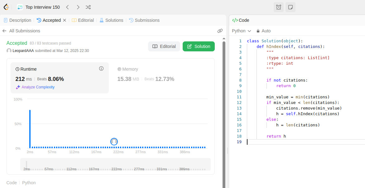 class Solution(object): def hIndex(self, citations): """ :type citations: List[int] :rtype: int """ if not citations: return 0 min_value = min(citations) if min_value < len(citations): citations.remove(min_value) h = self.hIndex(citations) else: h = len(citations) return h