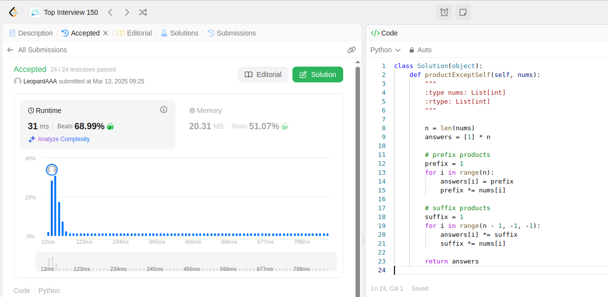 class Solution(object): def productExceptSelf(self, nums): """ :type nums: List[int] :rtype: List[int] """ n = len(nums) answers = [1] * n # prefix products prefix = 1 for i in range(n): answers[i] = prefix prefix *= nums[i] # suffix products suffix = 1 for i in range(n - 1, -1, -1): answers[i] *= suffix suffix *= nums[i] return answers