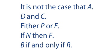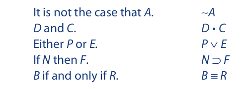 The expressions “it is not the case that,” “and,” “or,” “if . . . then . . . ,” and “if and only if” are translated by logical operators. The five logical operators are as follows: