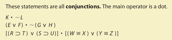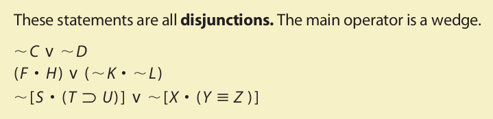 The statement ∼A is called a negation. The statement D • C is called a conjunctive statement (or a conjunction), and the statement P ∨ E is called a disjunctive statement (or a disjunction); in the conjunctive statement, the components D and C are called conjuncts, and in the disjunctive statement the components P and E are called disjuncts. The statement W ⊃ F is called a conditional statement (or a conditional), and it expresses the relation of material implication. Its components are called antecedent (W) and consequent (F). Lastly, B ≡ R is called a biconditional statement (or a biconditional), and it expresses the relation of material equivalence.