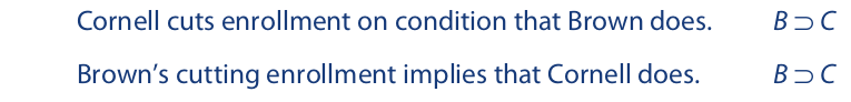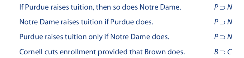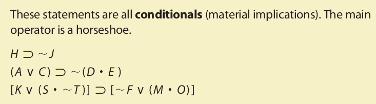The horseshoe symbol is used to translate “if . . . then . . . ,” “only if,” and similar expressions that indicate a conditional statement. The expressions “in case,” “provided that,” “given that,” and “on condition that” are usually translated in the same way as “if.” By customary usage, the horseshoe symbol is also used to translate “implies.” Although “implies” is used most properly to describe the relationship between the premises and conclusion of an argument, we may accept this translation as an alternate meaning for “implies.”