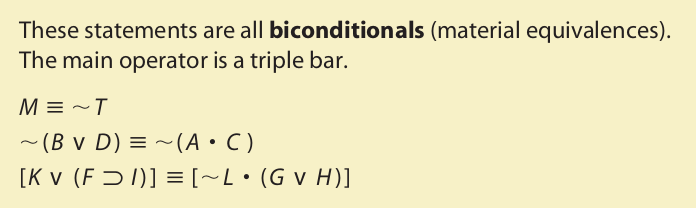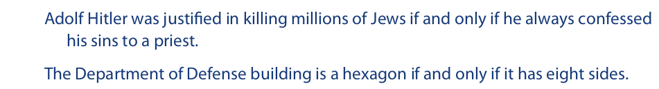 According to the ordinary interpretation, these statements are false. Confessing one’s sins to a priest does not justify anything, and hexagons, by definition, have six sides, not eight. Yet, when these statements are interpreted as expressing material biconditionals, both are true, because in each case the component statements are false. In cases like these, when the ordinary meaning of a biconditional conflicts with the truth-functional meaning, using the triple bar operator to translate it may not be appropriate. Furthermore, as with subjunctive conditionals, subjunctive biconditionals are generally not considered to be truth-functional at all, so the triple bar operator is not used to translate them.