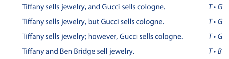 Note that the last example is equivalent in meaning to “Tiffany sells jewelry, and Ben Bridge sells jewelry.” To translate such a statement as a conjunction of two simple statements, the original statement must be equivalent to a compound statement in English. For example, the statement “Mary and Louise are friends” is not equivalent in meaning to “Mary is a friend, and Louise is a friend,” so this statement cannot be translated as M • L.