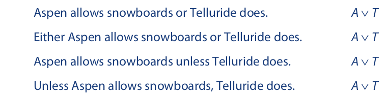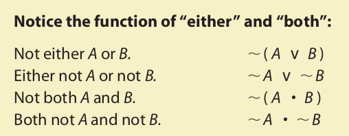 The word “either,”which is often used to introduce disjunctive statements, has primarily a punctuational meaning. The placement of this word often tells us where parentheses and brackets must be introduced in the symbolic expression. If parentheses or brackets are not needed, “either” does not affect the translation. A similar point applies to the word “both,” which is often used to introduce conjunctive statements. Here are some disjunctive statements:
