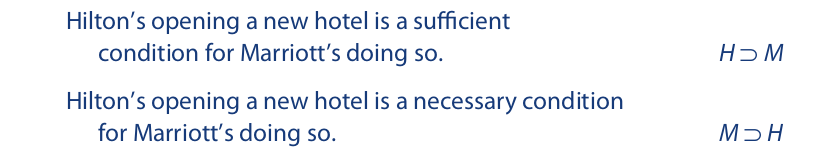 To translate statements involving sufficient and necessary conditions into symbolic form, place the statement that names the sufficient condition in the antecedent of the conditional and the statement that names the necessary condition in the consequent. The mnemonic device “SUN” may be conveniently used to keep this rule in mind. Turning the U sideways creates S ⊃ N, wherein S and N designate sufficient and necessary conditions, respectively. Whatever is given as a sufficient condition goes in the place of the S, and whatever is given as a necessary condition goes in the place of the N: