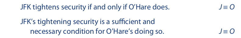 Analysis of the first statement reveals that J ≡ O is logically equivalent to (J ⊃ O) • (O ⊃ J). The statement “JFK tightens security only if O’Hare does” is translated J ⊃ O, and “JFK tightens security if O’Hare does” is translated O ⊃ J. Combining the two English statements, we have (J ⊃ O) • (O ⊃ J), which is just a longer way of writing J ≡ O. A similar analysis applies to the second statement. Because the order of the two conjuncts can be reversed, J ≡ O is logically equivalent to O ≡ J. However, when translating such statements, we adopt the convention that the letter representing the first English statement is written to the left of the triple bar, and the letter representing the second English statement is written to the right of the triple bar. Thus, the examples above are translated J ≡ O, and not O ≡ J.
