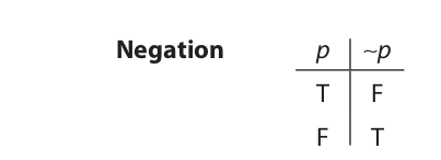 Now let us consider the definition of the tilde operator (negation). This definition is given by a truth table, an arrangement of truth values that shows in every possible case how the truth value of a compound proposition is determined by the truth values of its simple components. The truth table for negation shows how any statement having the form of a negation (∼p) is determined by the truth value of the statement that is negated (p):