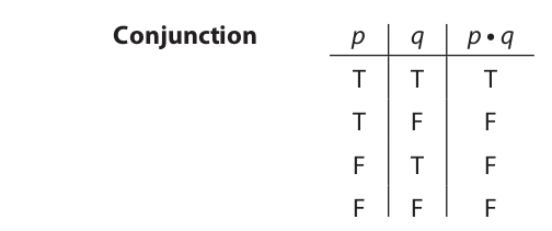 Let us now consider the definition of the dot operator (conjunction). The truth table that follows shows how any statement having the form of a conjunction (p • q) is determined by the truth values of its conjuncts (p, q):