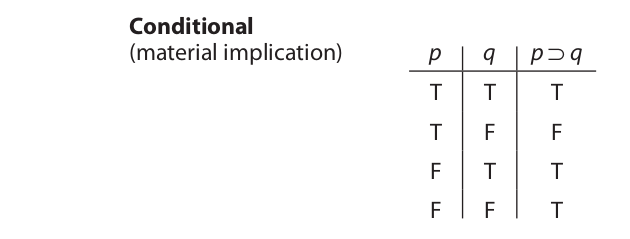 The truth table shows that a conditional statement is false when the antecedent is true and the consequent false and is true in all other cases. This truth-functional interpretation of conditional statements conforms in part with the ordinary meaning of “if . . . then . . .” and in part it diverges. Consider the following examples: