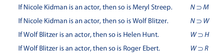 In these statements N, M, and H are true and W and R are false. Thus, according to the truth-functional interpretation, the first statement is true and the second false. This result conforms in large measure to our expectations. But the truth-functional interpretation of the last two statements is true. Although this result may not conflict with our expectations, it is not at all clear why these statements should be considered true.