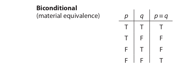 Lastly, let us consider the definition of the triple bar operator (material equivalence, or biconditional). Its truth table is as follows: