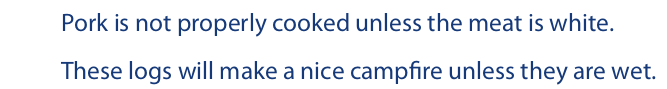 The first statement suggests that the meat cannot be white and at the same time not be properly cooked, and the second suggests that the logs cannot be wet and at the same time be used to make a nice campfire. Thus, if these statements are translated using the wedge operator, part of the meaning will be left out. If this additional part is essential, it can be included by adding the symbolic equivalent of “but not both” to the translation.