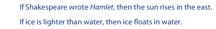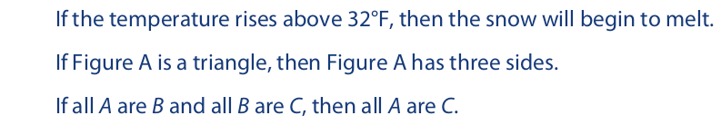 In all three examples the statement remains true even though the antecedent might be false. In the first, even though the temperature does not rise above 32°F at any particular moment, the law that governs the melting point of snow holds true. In other words, the statement (which expresses this law) is true regardless of the truth value of the antecedent. In the second, the mere fact that Figure A might not be a triangle does not affect the fact that a triangle, by definition, has three sides. Thus, the statement (which expresses this fact) is true regardless of the truth value of the antecedent. The third statement expresses a logical relationship between statements. This logical relationship remains unchanged regardless of what the terms A, B, and C are taken to represent. Thus, if A, B, and C represent “dogs,” “cats,” and “birds,” respectively, both antecedent and consequent turn out to be false, but the conditional statement remains true.