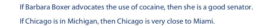 According to their ordinary language interpretation, both of these statements are false. Good senators do not advocate the use of cocaine, and Michigan is far from Miami. Yet, when these statements are interpreted as material conditionals, both turn out to be true, because their antecedents are false. In cases like these, when the truth-functional interpretation of a conditional statement conflicts with the ordinary language interpretation, using the horseshoe operator to translate it may not be appropriate.