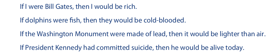 Subjunctive conditionals are often called counterfactual conditionals because their antecedents are typically false. As a result, the only way of determining their truth value in ordinary language is through some kind of inference. Thus, from our knowledge that Bill Gates is rich, we reason that if I were he, then I would be rich. Similarly, from our knowledge that all fish are cold-blooded, we conclude that if dolphins were fish, then they would be cold-blooded. On the other hand, we reason that the second two are false from our knowledge that lead is heavier than air and our knowledge that suicide results in death. Because the truth value of subjunctive conditionals is so closely tied to inferences like these and is so unrelated to the truth or falsity of the components, subjunctive conditionals are generally not considered to be truth functional at all, and the horseshoe operator is not used to translate them. But if they were interpreted truthfunctionally, note that all four of these statements would turn out true, because they have false antecedents.