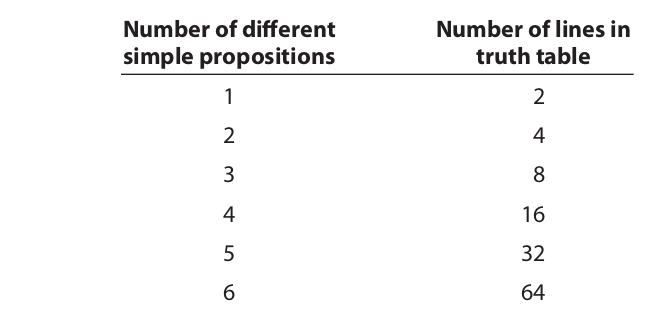 In constructing a truth table the first step is to determine the number of lines (or rows). Because each line represents one possible arrangement of truth values, the total number of lines is equal to the number of possible combinations of truth values for the simple propositions. As we saw in Section 6.2, if there is only one simple proposition, p, the number of lines in the truth table is two, because there are only two possible truth values for p: true, and false. If there are two simple propositions, p and q, there are four lines, because there are four combinations of truth values: p true and q true, p true and q false, p false and q true, and p false and q false. The relationship between the number of different simple propositions and the number of lines in the truth table is expressed as follows: