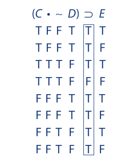 As the truth table we developed earlier indicates, (C • ∼D) ⊃ E is a contingent proposition. The column under the main operator contains at least one T and at least one F. In other words, the truth value of the compound proposition is “contingent” on the truth values of its components. Sometimes it is true, sometimes false, depending on the truth values of the components.
