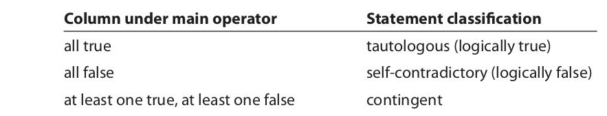 Truth tables may be used to determine whether the truth value of a compound statement depends solely on its form or whether it also depends on the specific truth values of its components. A compound statement is said to be a logically true or tautologous statement if it is true regardless of the truth values of its components. It is said to be a logically false or self-contradictory statement if it is false regardless of the truth values of its components. And it is said to be a contingent statement if its truth value varies depending on the truth values of its components. By inspecting the column of truth values under the main operator, we can determine how the compound proposition should be classified: