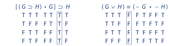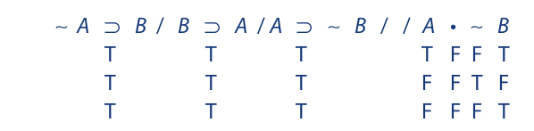 The last point is that it is essential that identical letters be assigned identical truth values. For example, if the letter A appears three times in a certain symbolized argument and the truth value T is assigned to it in one occurrence, then the same truth value must be assigned to it in the other occurrences as well. After the truth table has been completed, each letter should be rechecked to ensure that one and the same truth value has been assigned to its various occurrences.