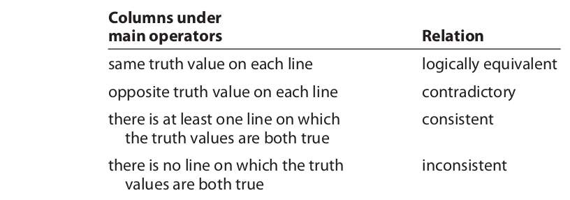 Truth tables may also be used to determine how two propositions are related to each other. Two propositions are said to be logically equivalent statements if they have the same truth value on each line under their main operators, and they are contradictory statements if they have opposite truth values on each line under their main operators. If neither of these relations hold, the propositions are either consistent or inconsistent. Two (or more) propositions are consistent statements if there is at least one line on which both (or all) of them turn out to be true, and they are inconsistent statements if there is no line on which both (or all) of them turn out to be true. By comparing the main operator columns, one can determine which is the case. However, because the first two relations are stronger than (and may overlap) the second two, the first two relations should be considered first.