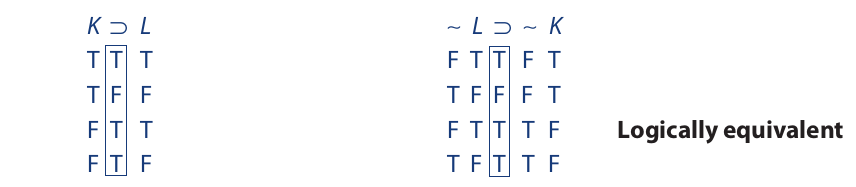 For any two propositions that are logically equivalent, the biconditional statement formed by joining them with a triple bar is tautologous. Thus, (K ⊃ L) ≡ (∼L ⊃ ∼ K) is tautologous. This is easy to see because the columns under the main operators of K ⊃ L and ∼L ⊃ ∼K are identical.