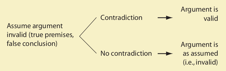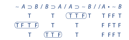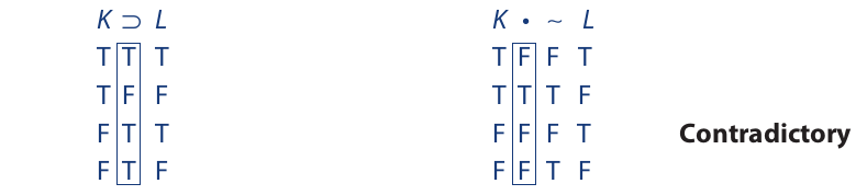 Three final points need to be made about indirect truth tables for arguments. First, if a contradiction is obtained in the assignment of truth values, every step leading to it must be logically implied by some prior step. In other words, the contradiction must be unavoidable. If a contradiction is obtained after truth values are assigned haphazardly or by guessing, then nothing has been proved. The objective is not to produce a contradiction but to avoid one (if possible).