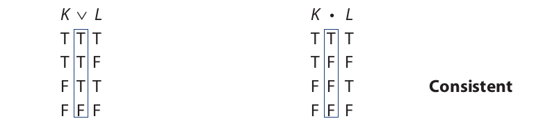 The next two propositions are consistent. On the first line of each truth table the column under the main operator turns out true. This means that it is possible for both propositions to be true, which is the meaning of consistency: