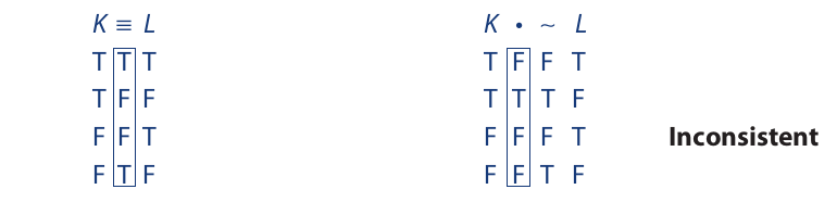 Finally, the next two propositions are inconsistent. There is no line in the columns under the main operators where the truth values are both true: