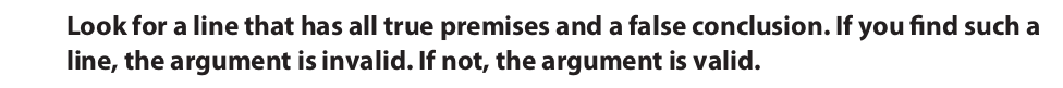 The logic behind the method of truth tables is easy to understand. By definition, a valid argument is one in which it is not possible for the premises to be true and the conclusion false. A truth table presents every possible combination of truth values that the components of an argument may have. Therefore, if no line exists on which the premises are true and the conclusion false, then it is not possible for the premises to be true and the conclusion false, in which case the argument is valid. Conversely, if there is a line on which the premises are true and the conclusion false, then it is possible for the premises to be true and the conclusion false, and the argument is invalid. Accordingly, to test the validity of an argument, use this procedure: