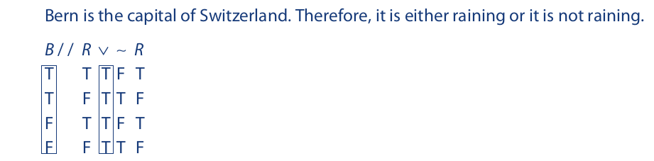The proposition on the left is tautologous (logically true or a tautology) because the column under the main operator is all true. The one on the right is self-contradictory (logically false) because the main operator column is all false. In neither case is the truth value of the compound proposition contingent on the truth values of the components. The one on the left is true regardless of the truth values of its components—in other words, necessarily true. The one on the right is necessarily false.