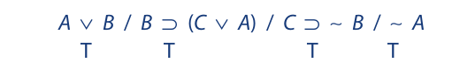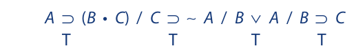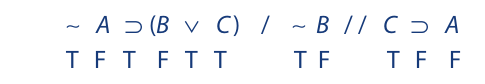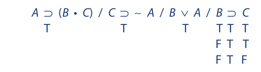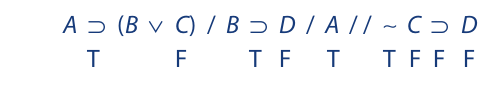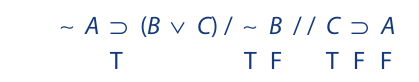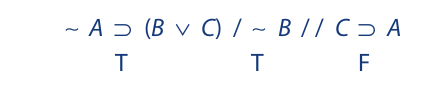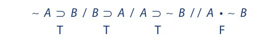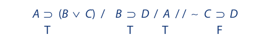 We begin as before by writing the symbolized argument on a single line, placing a single slash between the premises and a double slash between the last premise and the conclusion. Then we assign T to the premises and F to the conclusion: