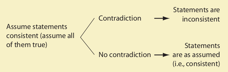 As with testing arguments, the objective is to avoid a contradiction. As soon as no contradiction is reached, we stop. The statements are consistent. Only if all three lines had led to a contradiction would these statements be inconsistent.