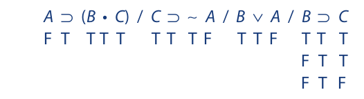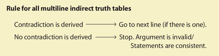 If an indirect truth table requires more than one line, the method to be followed is this. Either select one of the premises and compute all of the ways it can be made true, or select the conclusion and compute all of the ways it can be made false. This selection should be dictated by the requirement of simplicity. For example, if the conclusion can be made false in only two ways, while each of the premises can be made true in three ways, then select the conclusion. On the other hand, if one of the premises can be made true in only two ways while the conclusion can be made false in three ways, then select that premise. If neither of these situations prevails, then select the conclusion.