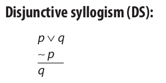 The first valid argument form to consider is disjunctive syllogism, which is defined as follows: