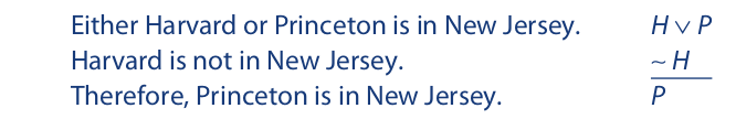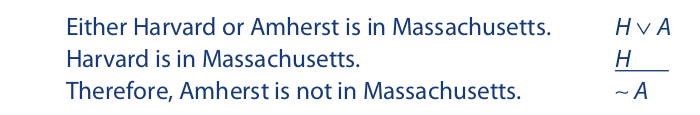 Since both Harvard and Amherst are in Massachusetts, the premises are true and the conclusion is false. Thus, the argument is invalid. Because the wedge symbol designates inclusive disjunction, the disjunctive premise includes the possibility of both disjuncts being true. Thus, for the argument to be valid, the other premise must eliminate one of the disjuncts.