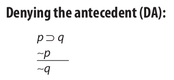 Denying the antecedent consists of a conditional premise, a second premise that denies the antecedent of the conditional, and a conclusion that denies the consequent: