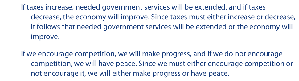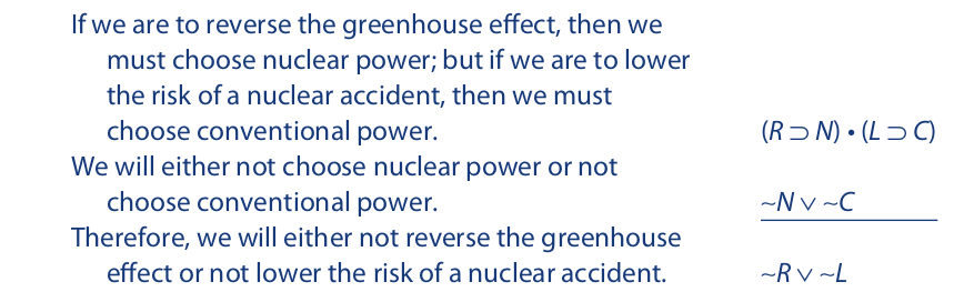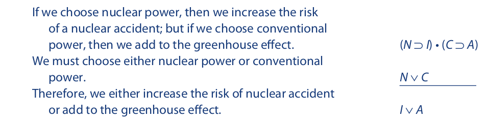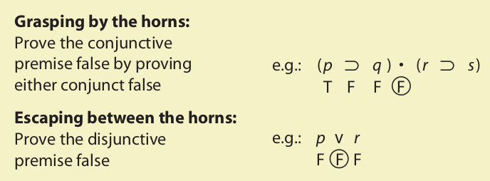 Now that we are familiar with several argument forms in propositional logic, we may return for a closer look at two of them, constructive and destructive dilemmas. Arguments having these forms occur frequently in public debate, where an arguer may use them to trap an opponent. Since both forms are valid, the only direct mode of defense available to the opponent is to prove the dilemma unsound. This can be done by proving at least one of the premises false. If the conjunctive premise (otherwise called the “horns of the dilemma”) is proven false, the opponent is said to have “grasped the dilemma by the horns.” This, of course, may be done by proving either one of the conditional statements false. If, on the other hand, the disjunctive premise is proven false, the opponent is said to have “escaped between the horns of the dilemma.” The latter strategy often involves finding a third alternative that excludes the two that are given in the disjunctive premise. If such a third alternative can be found, both of the given disjuncts will be proved false. Consider the following constructive dilemma:
