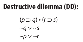 The destructive dilemma is also a valid argument form. It is similar to the constructive dilemma in that it includes a conjunctive premise made up of two conditional statements and a disjunctive premise. However, the disjunctive premise denies the consequents of the conditionals (like modus tollens), and the conclusion denies the antecedents: