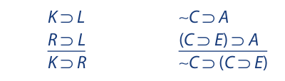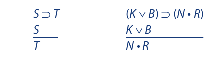 In the first argument S and T are uniformly substituted in the place of p and q, and in the second argument K ∨ B and N • R are uniformly substituted in the place of p and q.