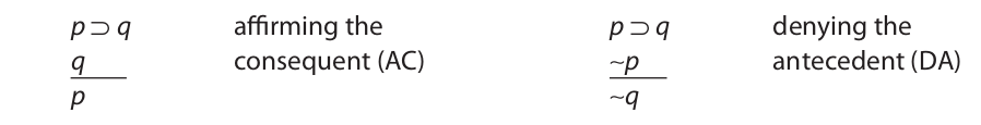 Sometimes the uniform substitution of statements in the place of p and q results in an invalid argument, and sometimes it does not. Both of the following symbolized arguments are substitution instances of affirming the consequent, but the one on the left is invalid while the one on the right is valid: