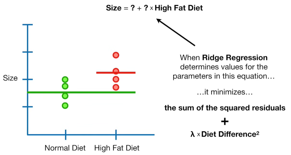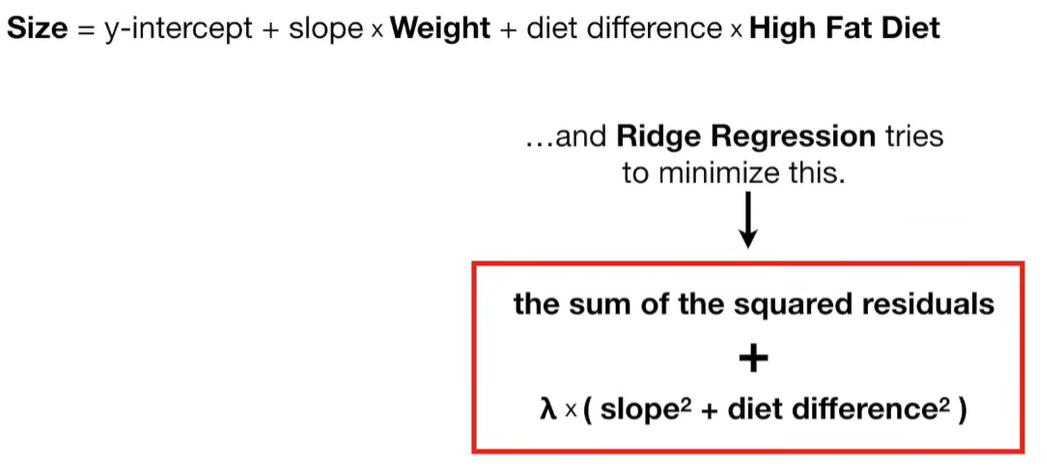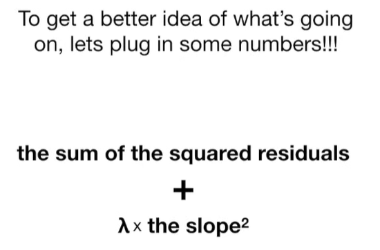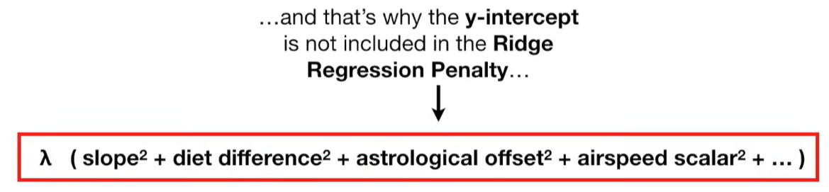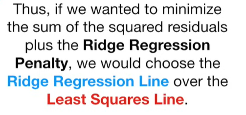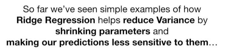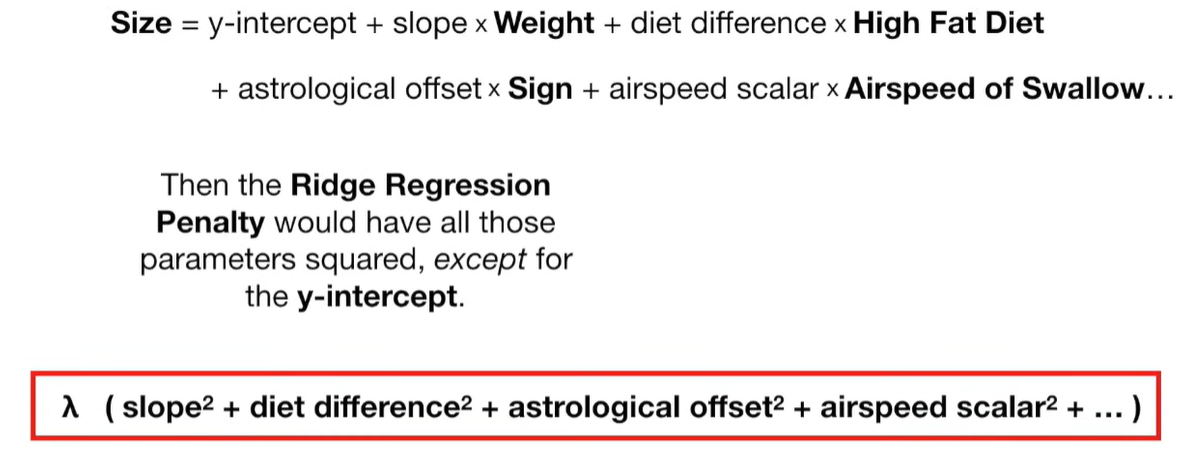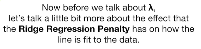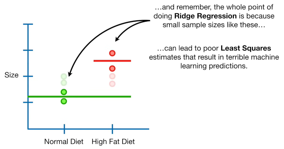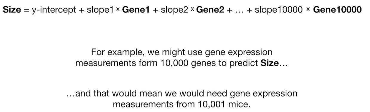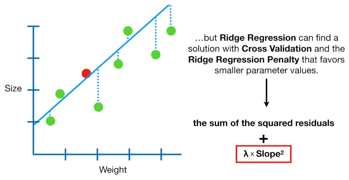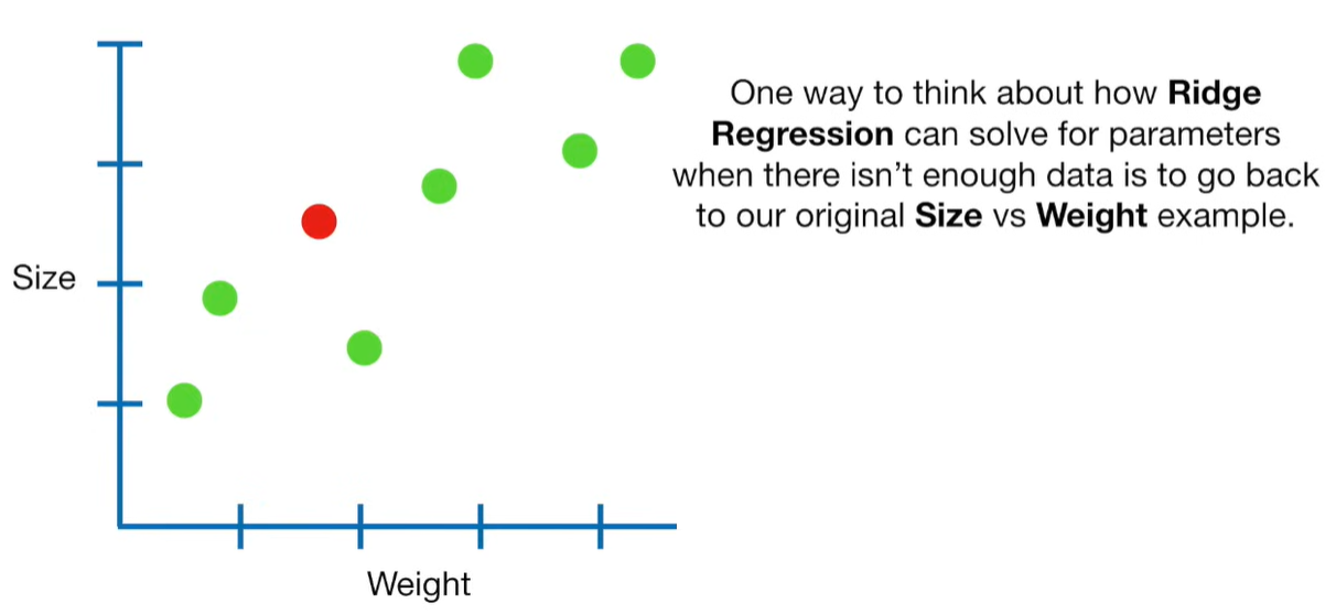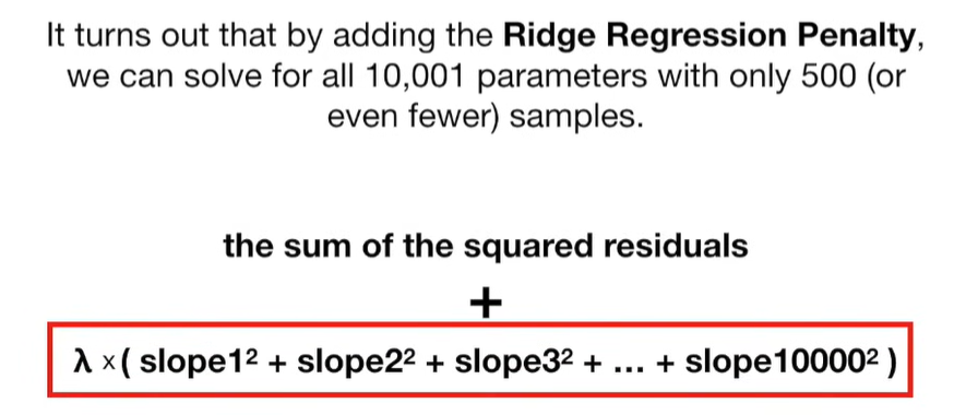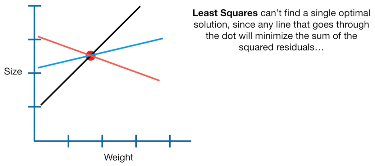 A lot of people ask about 15:34 and how we are supposed to do Cross Validation with only one data point. At this point I was just trying to keep the example simple and if, in practice, you don't have enough data for cross validation then you can't fit a line with ridge regression. However, much more common is that you might have 500 variables but only 400 observations - in this case you have enough data for cross validation and can fit a line with Ridge Regression, but since there are more variables than observations, you can't do ordinary least squares.