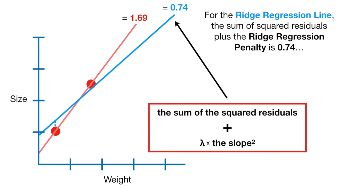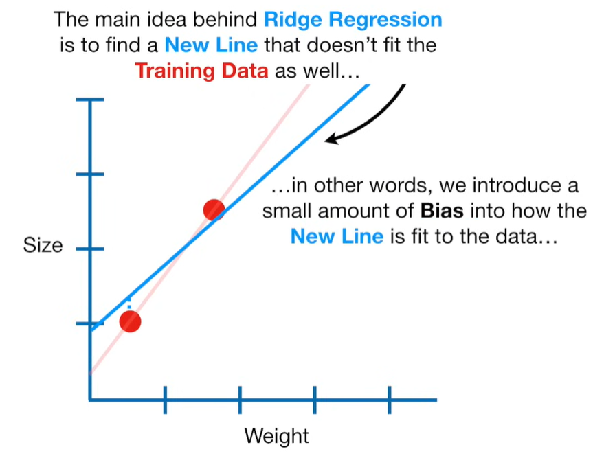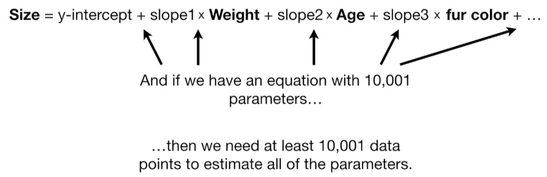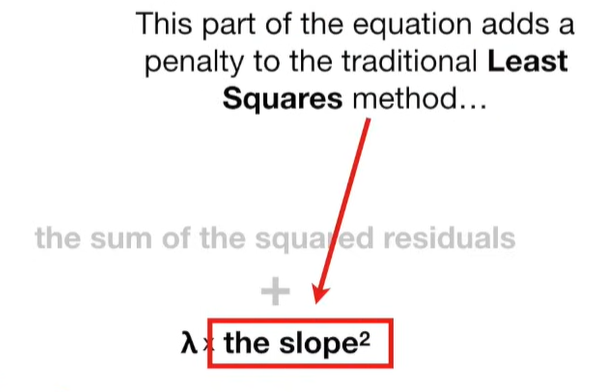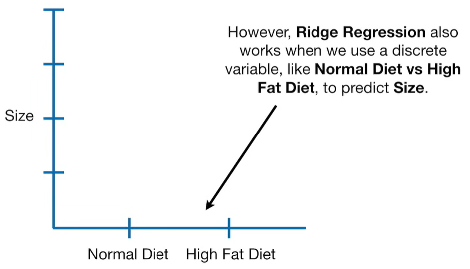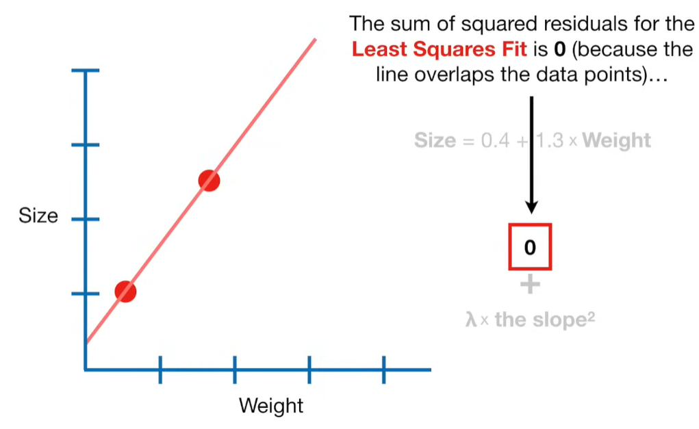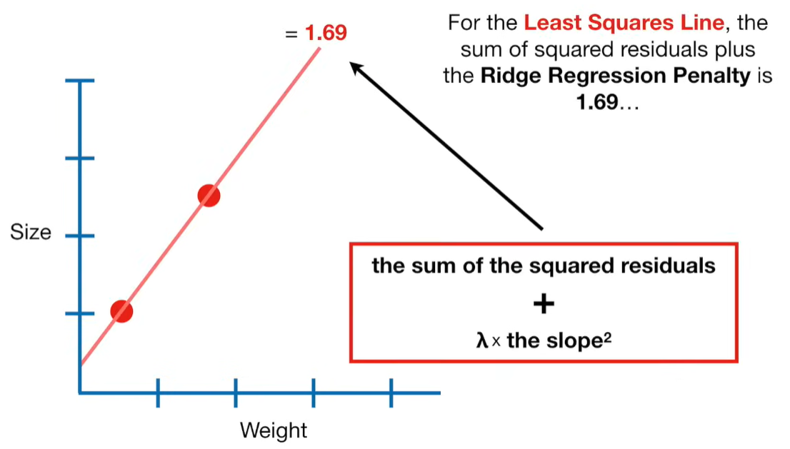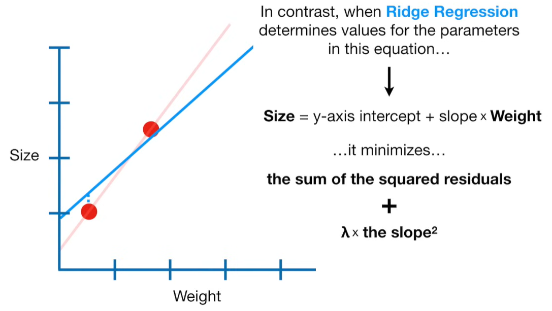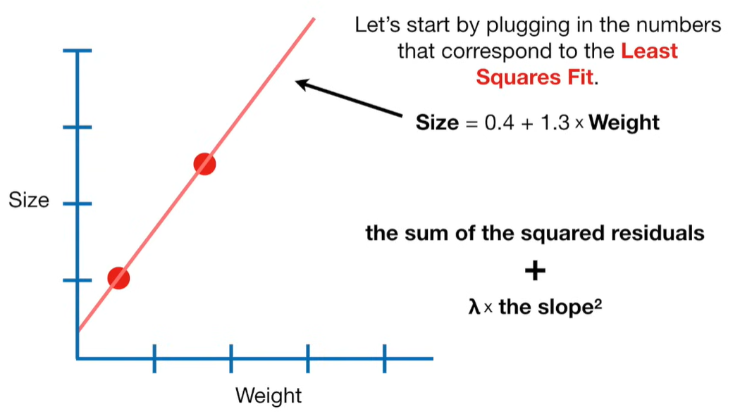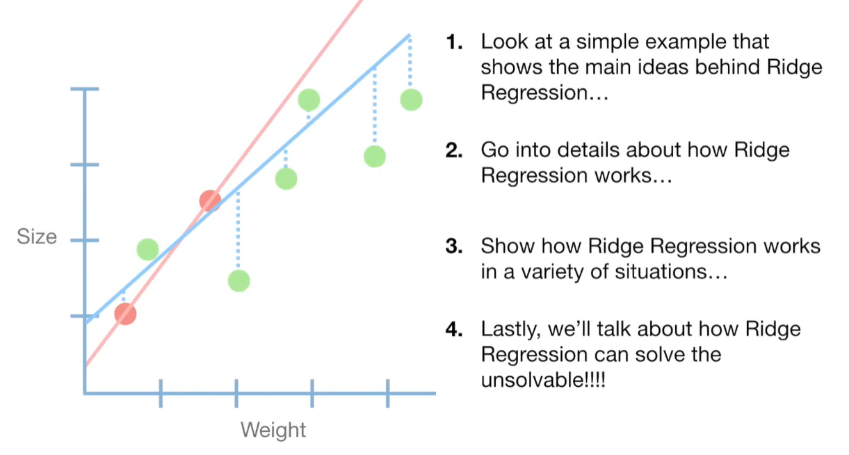A lot of people ask about 15:34 and how we are supposed to do Cross Validation with only one data point. At this point I was just trying to keep the example simple and if, in practice, you don't have enough data for cross validation then you can't fit a line with ridge regression. However, much more common is that you might have 500 variables but only 400 observations - in this case you have enough data for cross validation and can fit a line with Ridge Regression, but since there are more variables than observations, you can't do ordinary least squares.